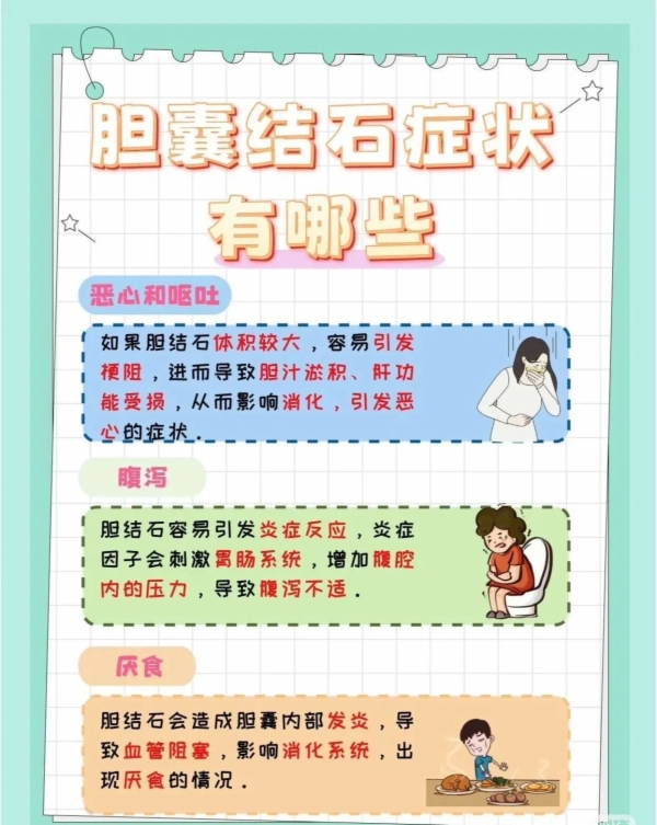 膽囊結(jié)石的癥狀:膽囊結(jié)石的癥狀因人而異,有些患者可能完全沒有癥狀,這種結(jié)石被稱為“靜止性結(jié)石”。然而,當(dāng)結(jié)石刺激膽囊壁或嵌頓在膽囊管時(shí),就可能出現(xiàn)膽絞痛、消化不良、發(fā)熱及黃疸等一系列癥狀。