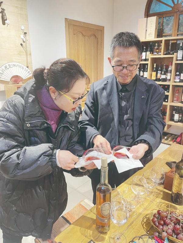 耿學(xué)剛給記者講解葡萄酒知識(shí)。