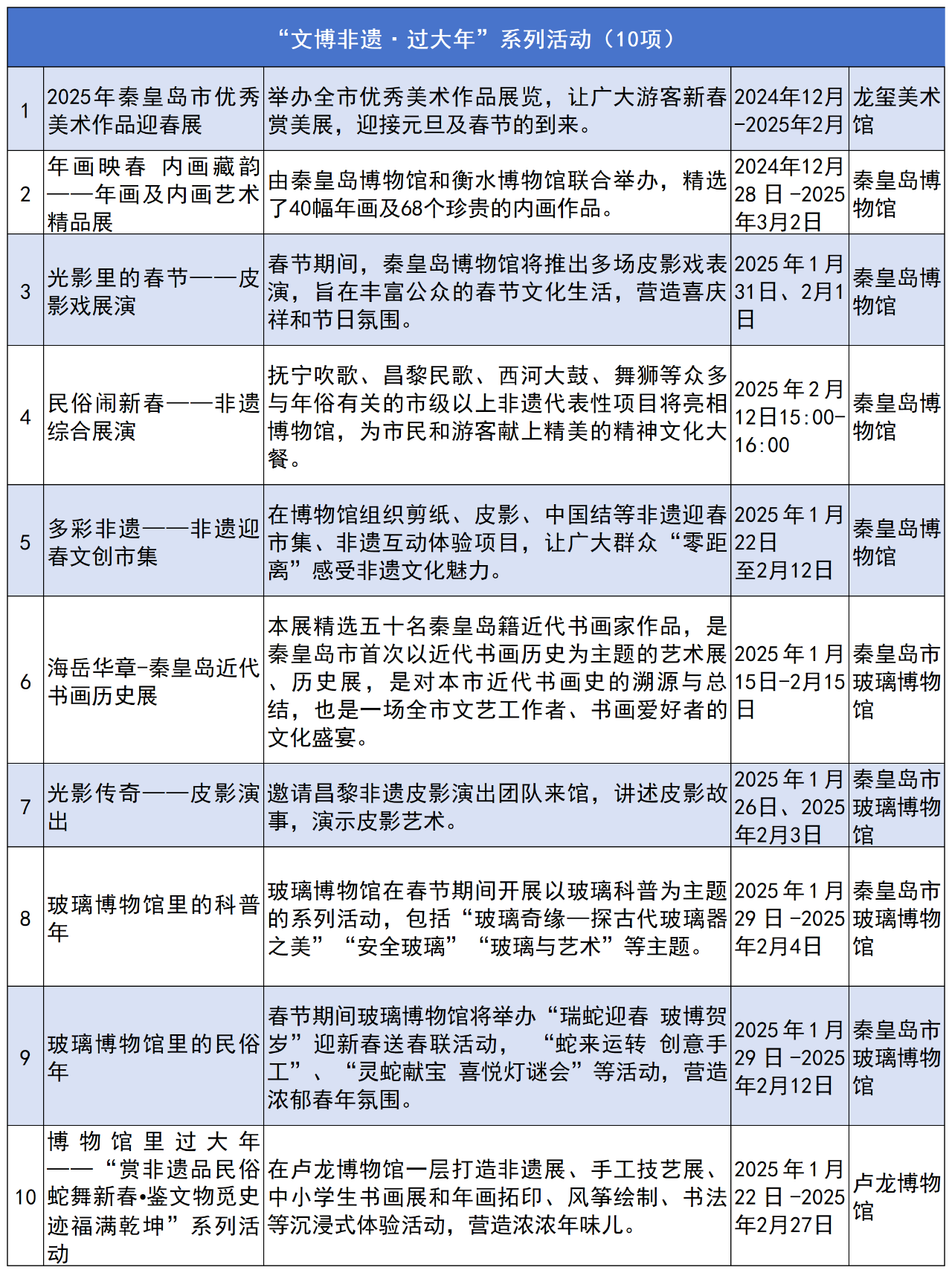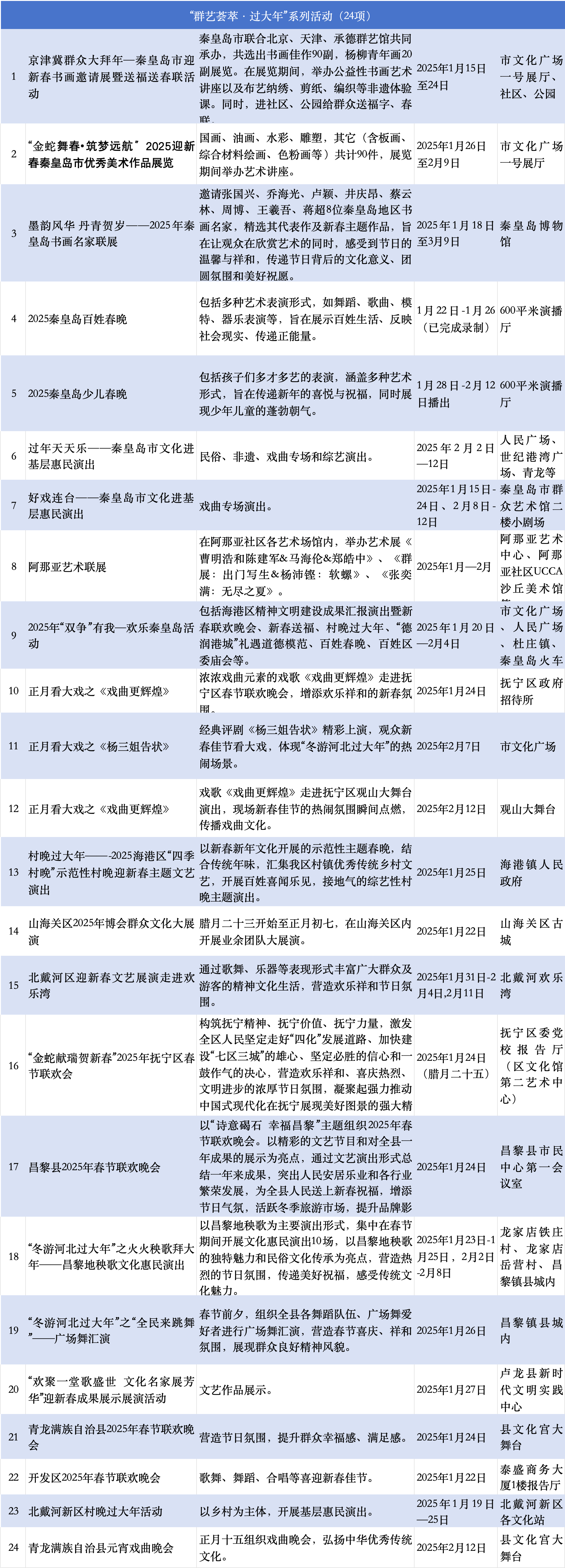 美術(shù)展、書畫展等各類文博展覽以及皮影戲、撫寧吹歌、昌黎民歌、西河大鼓等眾多年俗非遺項目,讓市民、游客感受秦皇島傳統(tǒng)年俗的魅力。