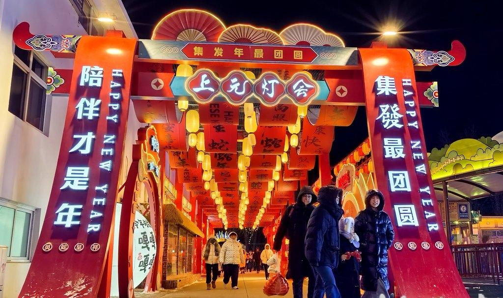 十二生肖燈組、蛇年生肖燈組、新春年味燈組、花仙賀歲燈組……分布在不同區(qū)域的近百組花燈組成的燈海,點亮了夜空。而幾天前的降雪留下了一個銀裝素裹的世界,襯托得當晚的花燈更加璀璨,增加了別樣的氛圍感。