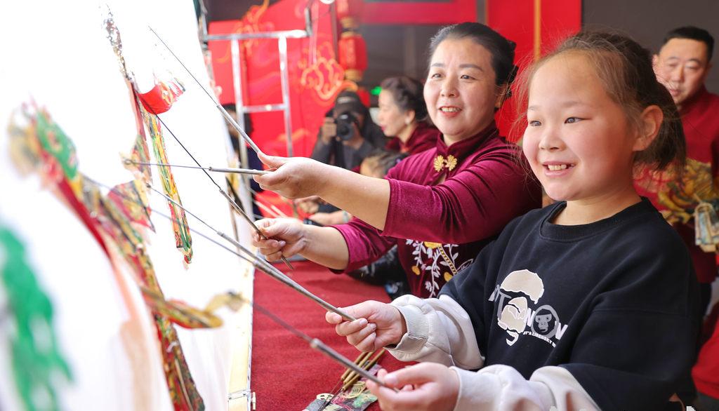 1月31日,民間藝人在秦皇島博物館帶領(lǐng)小朋友體驗(yàn)皮影。