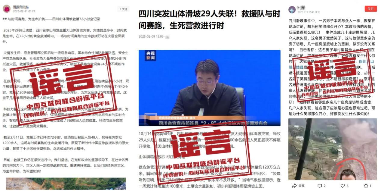 ??詳情:2025年2月8日,四川宜賓筠連發(fā)生山體滑坡已造成1人遇難、28人失聯(lián),2人受傷。全民救援關(guān)鍵時(shí)刻,部分網(wǎng)民為吸引流量博取關(guān)注,在網(wǎng)上捏造不實(shí)信息、散布災(zāi)情謠言、混淆大眾視聽(tīng),不僅擾亂了社會(huì)公共秩序,更對(duì)救援工作造成困擾。