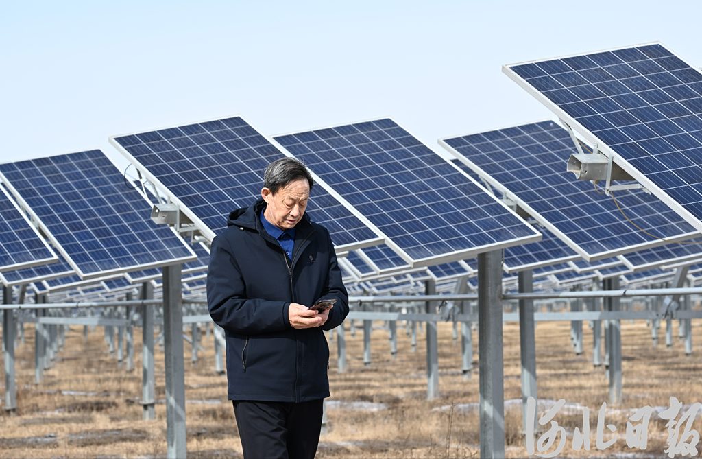 3月2日,張北縣小二臺鎮(zhèn)德勝村黨支部書記葉潤兵通過手機(jī)查看光伏設(shè)備運(yùn)行情況。河北日報(bào)記者耿輝攝