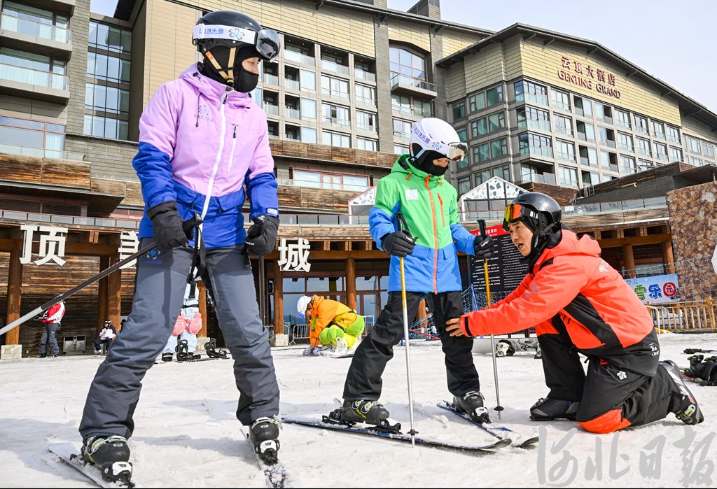 3月1日,崇禮區(qū)云頂滑雪場滑雪教練盧永帥(右一)在指導(dǎo)學(xué)員學(xué)習(xí)滑雪。河北日報(bào)記者耿輝攝