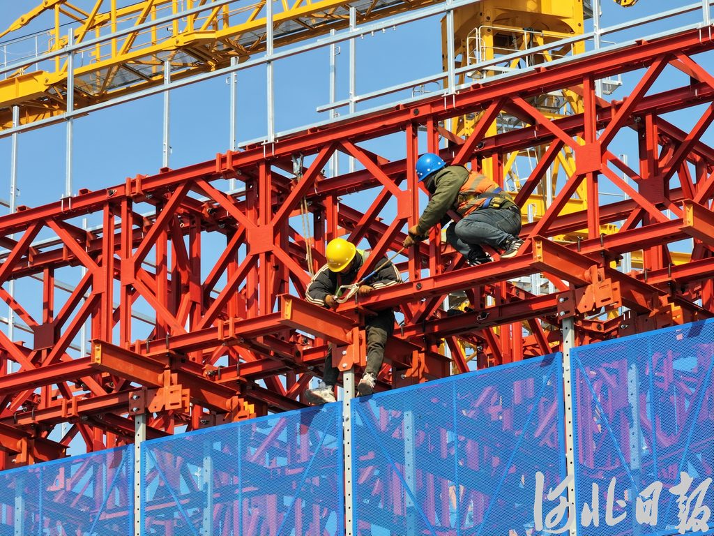 2月19日,雄安城際站及國貿(mào)中心片區(qū)建設(shè)現(xiàn)場,工人們正在搭建造樓機(jī)。河北日報(bào)記者李暢攝