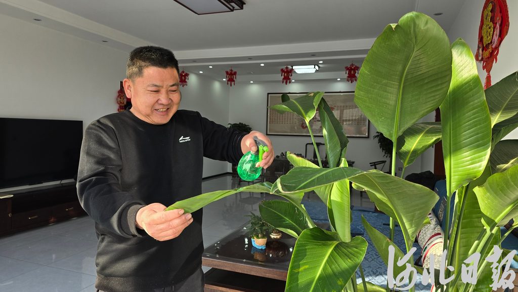 2月27日,涿州市刁窩鎮(zhèn)萬全莊村村民付繼軍正在新房里為花草噴水。河北日報(bào)記者林鳳斌攝