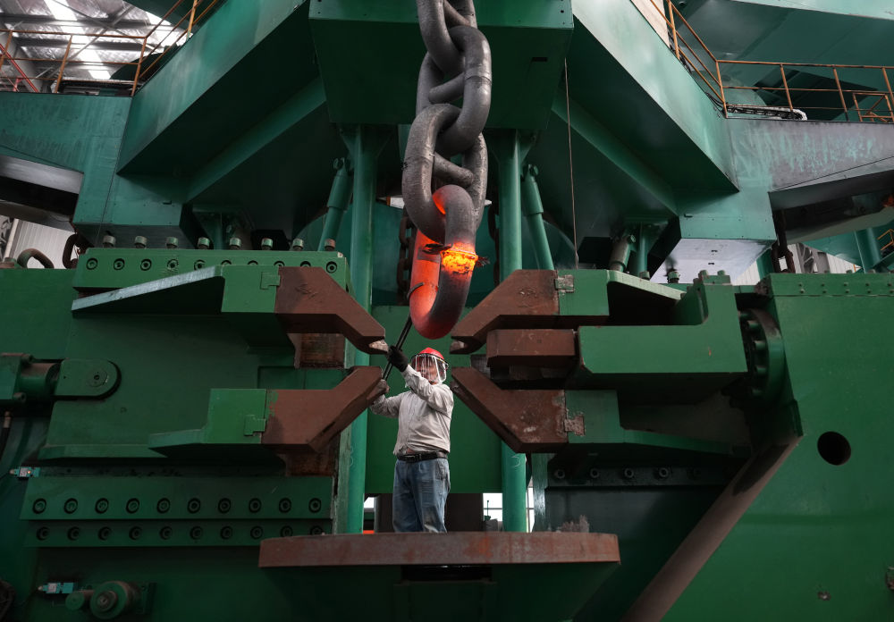 2024年6月4日,江蘇泰州靖江市江蘇亞星錨鏈股份有限公司工人在生產(chǎn)車間作業(yè)。該公司前身是40多年前創(chuàng)辦于靖江東興鎮(zhèn)的一個小廠,經(jīng)過多年發(fā)展,逐漸成長為國家級制造業(yè)單項冠軍示范企業(yè)。目前該公司船用鏈條全國市占率達70%,全球市占率超50%,業(yè)務已拓展到海洋鉆井平臺、海洋生產(chǎn)平臺、海上風電設施的系泊錨鏈等領(lǐng)域。