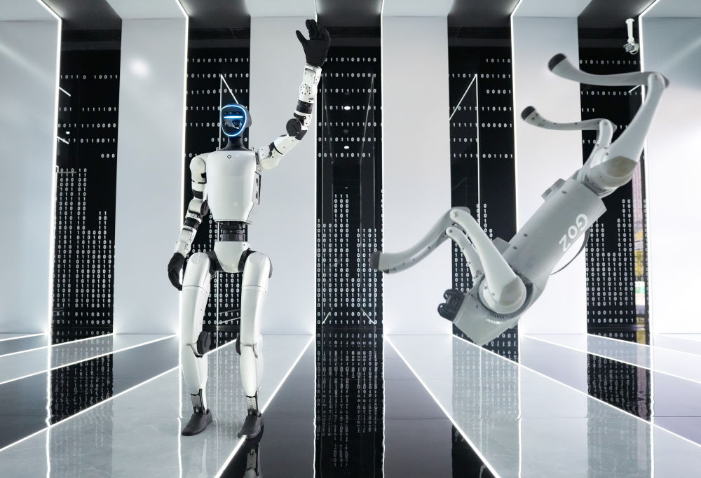 2025年3月1日,在杭州宇樹科技有限公司的產(chǎn)品展示中心,人形機器人和四足機器人在工作人員控制下做動作。人形機器人是人工智能技術(shù)的集成體現(xiàn),在這個未來產(chǎn)業(yè)的重要賽道上,一大批中國企業(yè)深耕技術(shù)、持續(xù)創(chuàng)新,國產(chǎn)機器人正在跑出“加速度”。