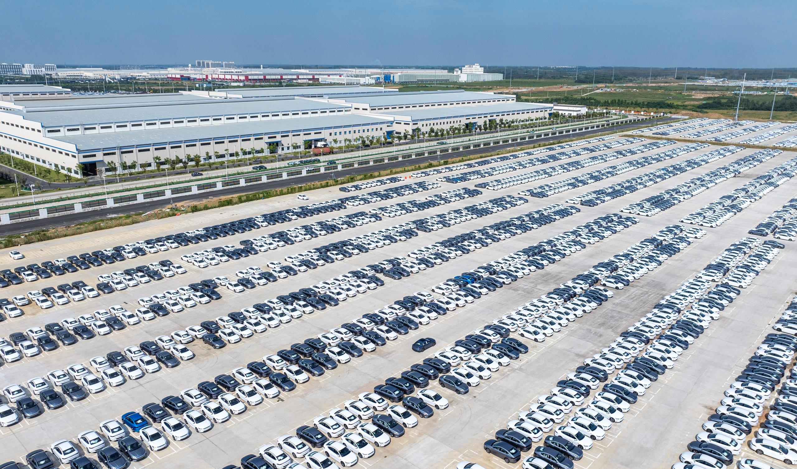 △2024年9月,安徽合肥,整齊停放的新能源汽車正在等待裝車銷往國(guó)內(nèi)外市場(chǎng)。