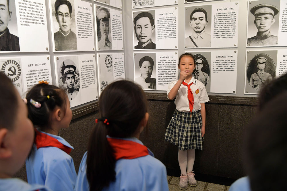 2021年5月12日,在井岡山革命烈士陵園,“小紅軍宣講團”的成員周煜菡給前來參觀研學的學生們進行義務(wù)講解。井岡山小學把“紅色德育”作為立德樹人的重要抓手,成立了“小紅軍宣講團”,培養(yǎng)了一批講好紅色故事、傳承先輩精神的小小義務(wù)講解員。