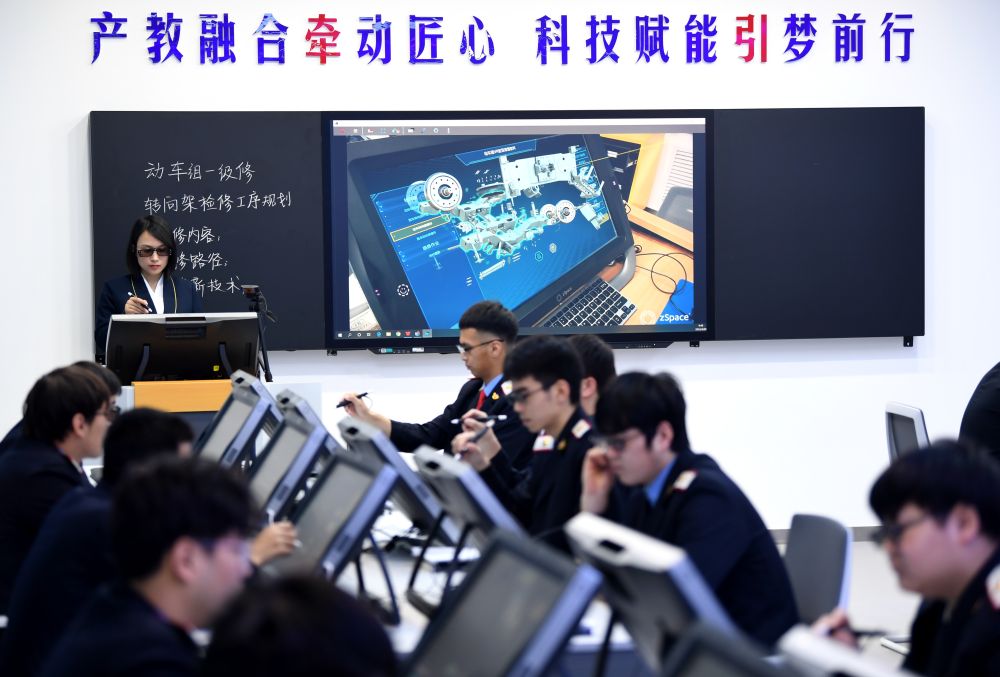 2022年4月29日,在西安鐵路職業(yè)技術(shù)學院,學生在動車組VR智慧課堂上模擬檢修。近年來,我國著力促進教育公平,提升教育質(zhì)量,加快推進教育現(xiàn)代化,教育數(shù)字化工作持續(xù)推進、成果豐碩。