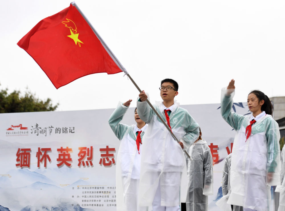 2023年4月4日,“清明節(jié)的銘記——緬懷英烈志 創(chuàng)造新偉業(yè)”主題教育系列活動啟動儀式在中國人民抗日戰(zhàn)爭紀念館舉行。這是少先隊員代表在啟動儀式上高唱《我們是共產(chǎn)主義接班人》。