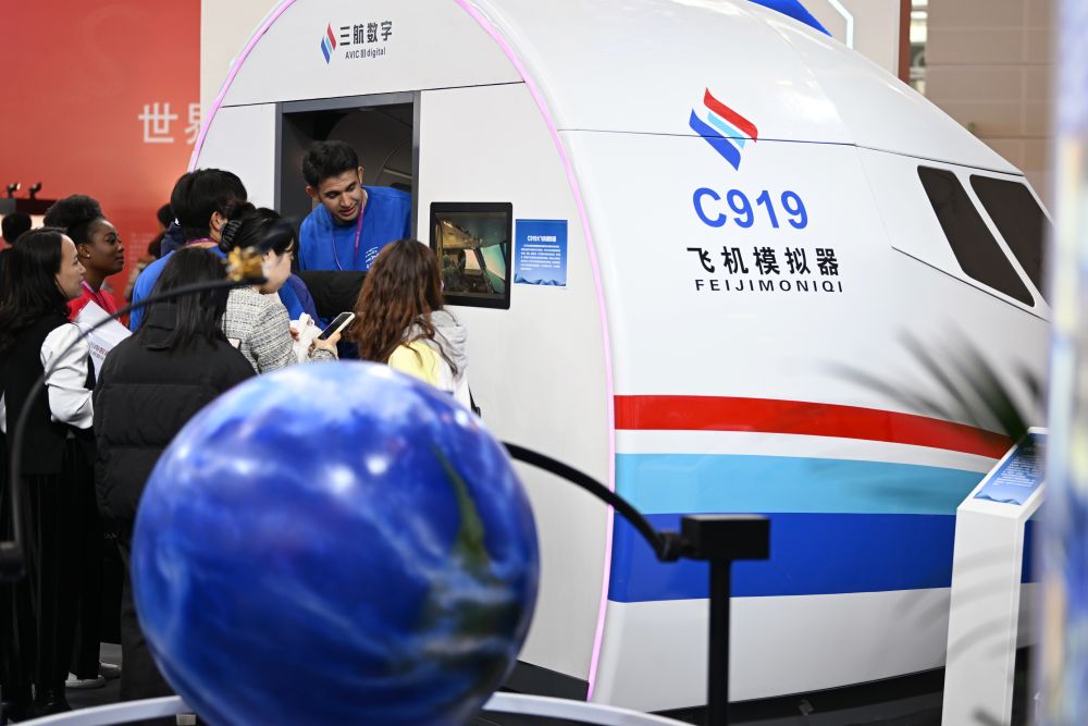 2024年11月21日,參會者在天津舉行的世界職業(yè)技術(shù)教育發(fā)展大會專題展上參觀C919飛機模擬器。展覽設(shè)置了技能塑造人生、技藝傳承文明、服務(wù)產(chǎn)業(yè)升級、國際交流合作、產(chǎn)教互融互通等7個板塊,全方位展示職業(yè)教育改革發(fā)展成果。