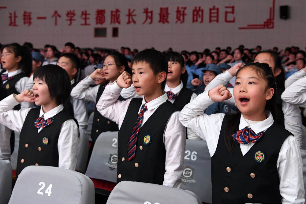 2024年11月13日,在“中流砥柱——中國共產(chǎn)黨抗戰(zhàn)文物展校園巡展”活動上,北京市第四中學順義分校學生們共同宣誓,傳承紅色基因,接受愛國教育。該巡展把中國人民抗日戰(zhàn)爭紀念館的館藏資源搬進北京中小學校園,打造流動博物館和紅色思政課堂。
