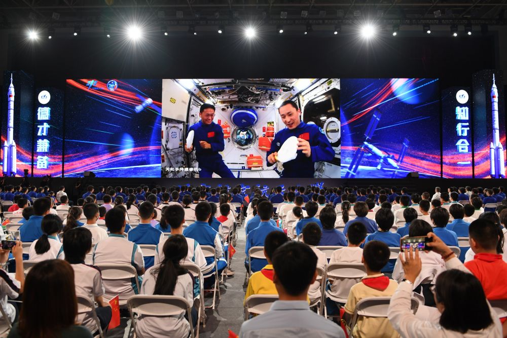 2023年9月21日,在北京航空航天大學,學生收看“天宮課堂”第四課。神舟十六號航天員景海鵬、朱楊柱、桂海潮在軌展示介紹中國空間站夢天實驗艙工作生活場景,演示球形火焰實驗、奇妙“乒乓球”實驗、動量守恒實驗以及又見陀螺實驗,并與地面課堂進行互動交流。