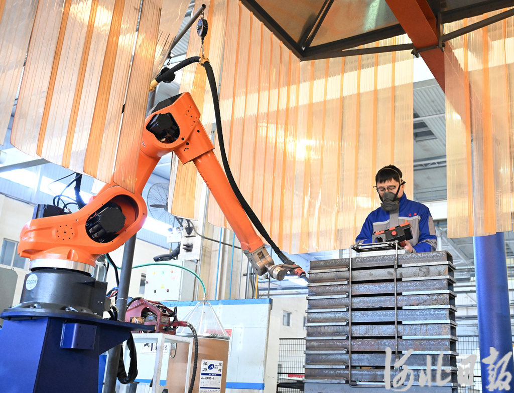 1月10日,石家莊煤礦機(jī)械有限責(zé)任公司生產(chǎn)車間,智能焊接機(jī)器人替代人工焊接。河北日報記者史晟全攝
