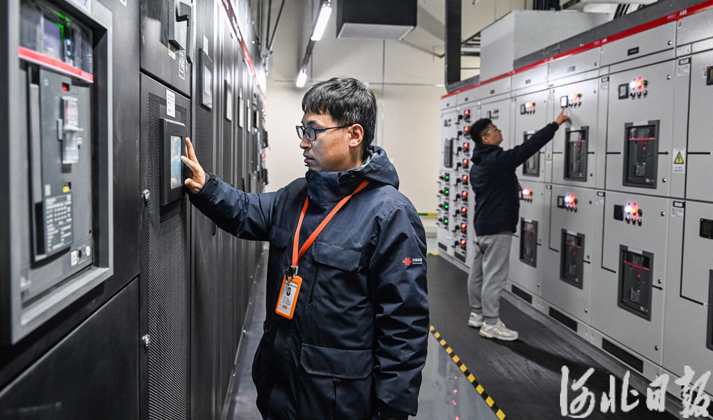 2月25日,位于懷來縣的中國聯(lián)通(懷來)大數(shù)據(jù)創(chuàng)新產(chǎn)業(yè)園工作人員在檢查設(shè)備運(yùn)行情況。河北日報記者耿輝攝