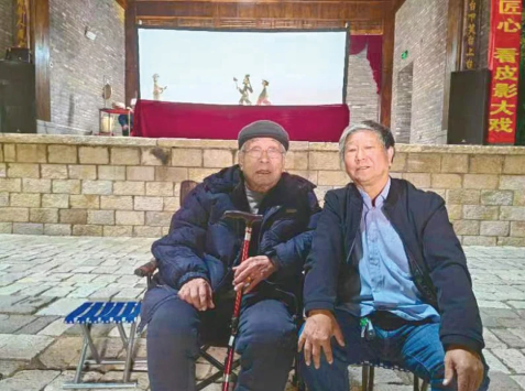 劉立新與“影戲箭桿王”齊永衡在皮影戲臺前合影。