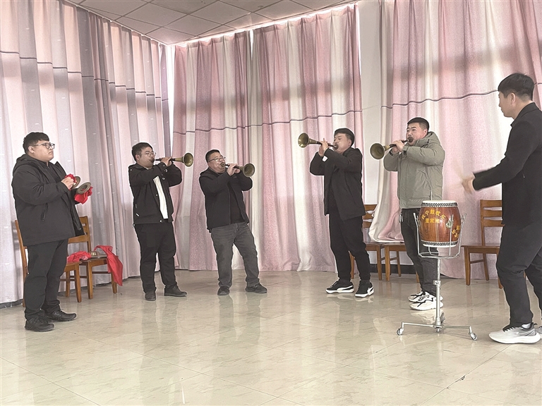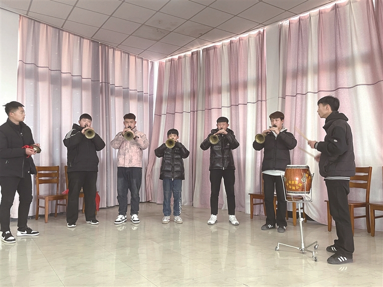 董連吉帶領(lǐng)徒弟們吹奏《新編滿堂紅》。