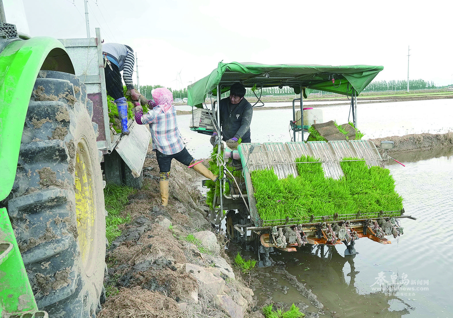 秦皇島市昌黎縣劉臺莊鎮(zhèn)東新立莊村的農(nóng)民將水稻秧苗搬運到插秧機上,進行插秧。 新華社記者楊世堯攝