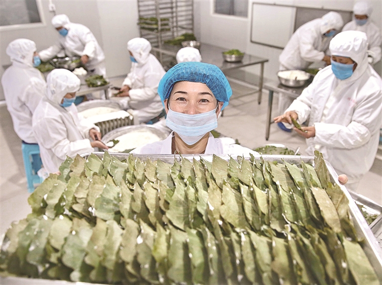 工人們必須身著白色消毒工裝,在長(zhǎng)桌前取葉、抹面、鋪餡、合攏;用來(lái)制作桲欏葉餅的葉子橫向直徑嚴(yán)格控制在16至18厘米,超標(biāo)的葉片影響觀感,不足的則容易露餡兒;和面水溫需隨季節(jié)精密調(diào)控,淀粉遇熱糊化的程度直接影響食用口感;抹面時(shí)不能過(guò)薄,面薄了蒸熟后會(huì)粘在葉子上,過(guò)厚又會(huì)降低餡料的鮮度;韭菜必須人工切段,每刀落下都要保持2至3厘米長(zhǎng)度……