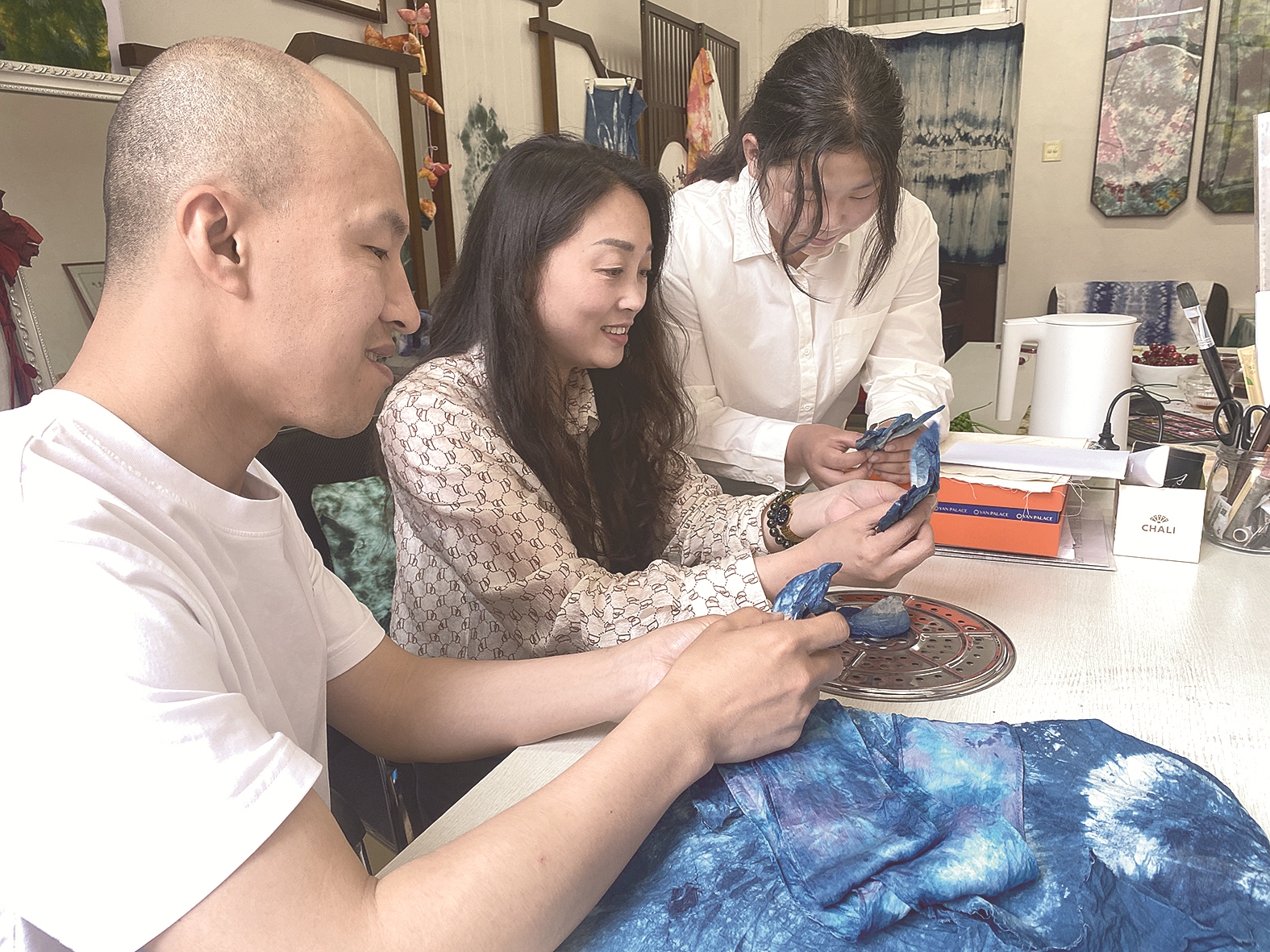 王博和兩位入室弟子魏磊(左一)、武貞羽(右一)共同制作扎染作品。