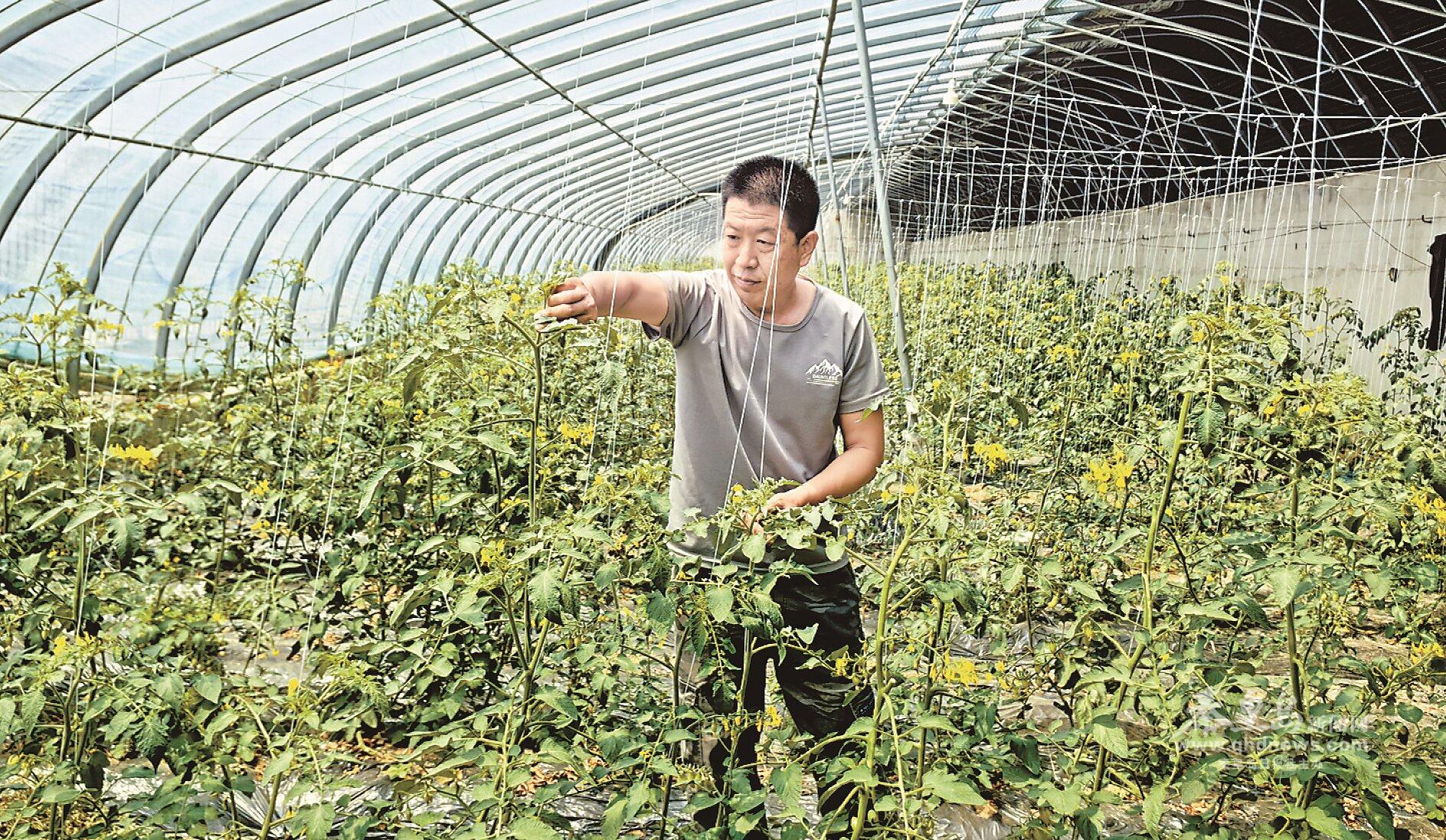 青龍河村村民郭保軍正在為西紅柿藤蔓打尖。河北日報記者孫也達攝