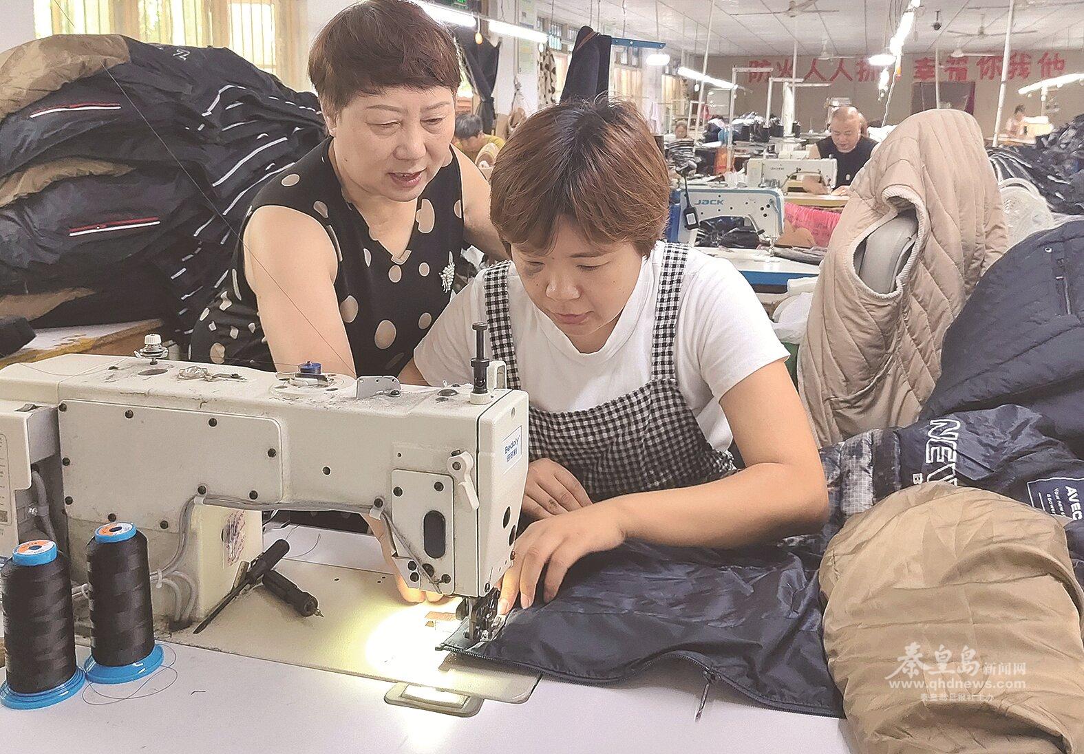 楊繡霞(左)正在傳授工人縫制技巧。 記者 方竟凱 攝