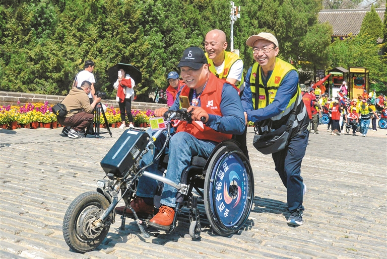 志愿者幫助肢殘人士登上長(zhǎng)城。 本報(bào)記者方竟凱攝