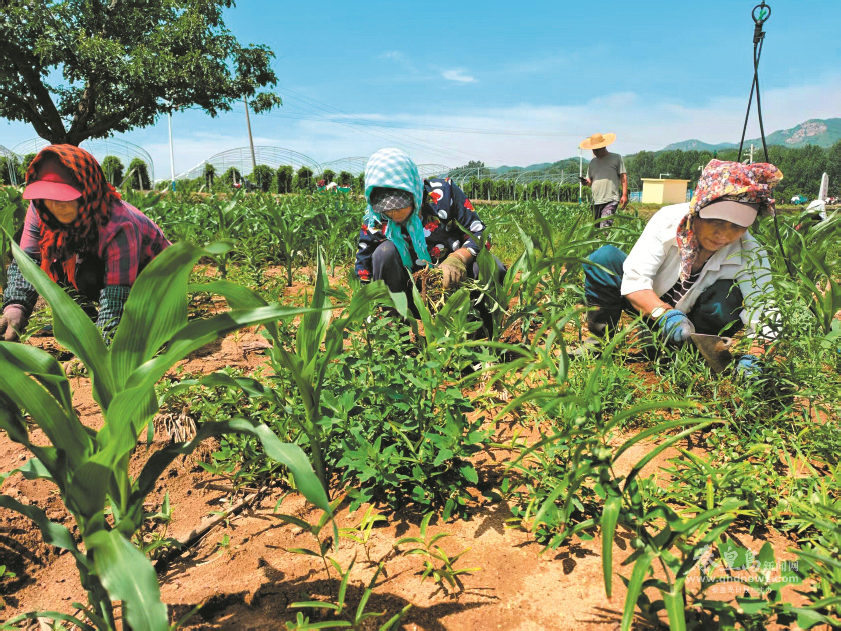 村民在中草藥種植基地除草。 記者 孟曉冬 攝