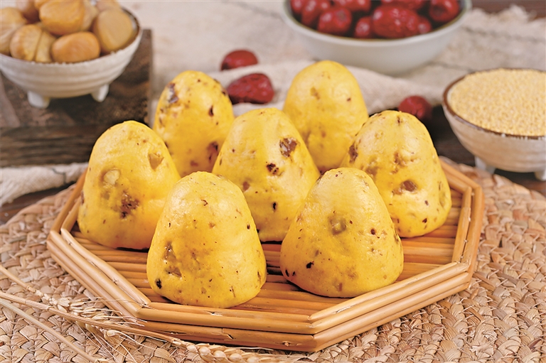 許多消費(fèi)者認(rèn)識(shí)“在旗”是從一款黏豆包開(kāi)始的。綠色的桲欏葉襯底,黃澄澄的黏豆包散發(fā)著誘人的光澤,一股混合著大黃米面和樹(shù)葉的清香撲鼻而來(lái),讓人頓時(shí)口舌生津。