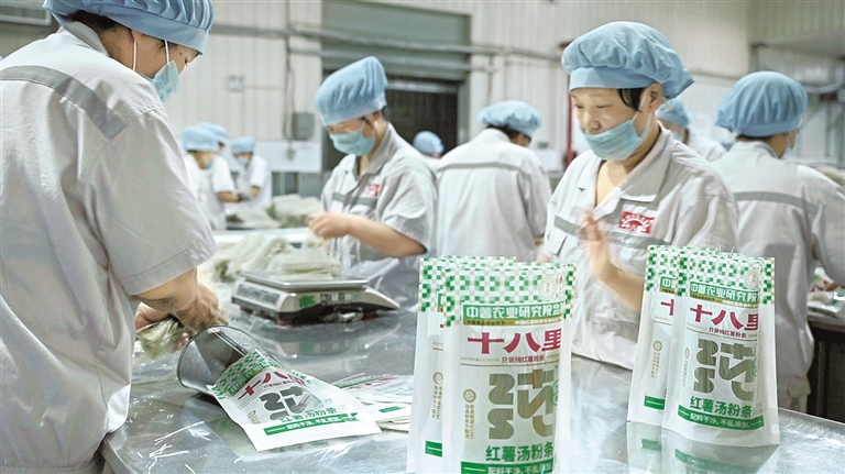 走進(jìn)中薯農(nóng)業(yè)現(xiàn)代化的制粉車間,只見工人將煮熟的粉條浸入涼水,女工郝秋香一邊利落地操作,一邊介紹:“粉條一年四季都要過涼水,過了涼水的粉條瞬間就變得絲滑了。”這涼水的一激一收,正是賦予粉條彈牙口感的點(diǎn)睛之筆。不遠(yuǎn)處,掛滿粉條的架子被緩緩?fù)迫肜鋷欤M陽光的電子控溫設(shè)備則進(jìn)行著溫和的烘干。在包裝車間,70多名工人指尖翻飛,一份份勻稱、透亮的粉條被裝入袋中。包裝車間主任楊連紅言語間透著忙碌的充實(shí):“一天下來,能包裝十五六噸的粉條,過幾天還有訂單,還會更忙些?!?/p>