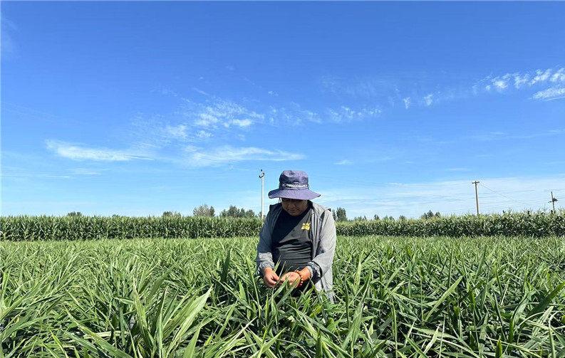 8月22日,撫寧區(qū)撫寧鎮(zhèn)種植戶溫財(cái)查看生姜長(zhǎng)勢(shì)及病蟲害情況。武淑艷攝
