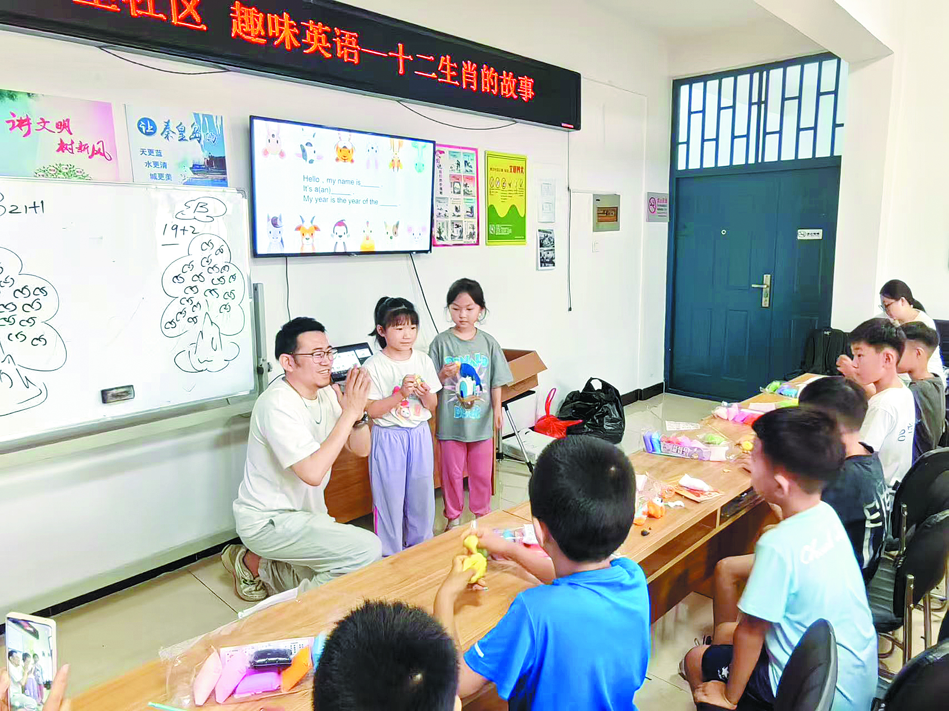 同樣是橋東里社區(qū),畫(huà)風(fēng)一轉(zhuǎn),又變成了有趣的“趣味英語(yǔ)·十二生肖故事會(huì)”?!癛at、Tiger、Dragon......”孩子們跟著老師大聲念著十二生肖的英文單詞,還分組用英語(yǔ)表演起了“十二生肖由來(lái)”的中國(guó)傳統(tǒng)故事。7歲的樂(lè)樂(lè)表演完興奮地說(shuō):“用英語(yǔ)講我們中國(guó)的故事,太酷了!”“你看,學(xué)英語(yǔ)和學(xué)傳統(tǒng)文化,原來(lái)可以一點(diǎn)也不沖突,還能這么好玩?!睒?lè)樂(lè)家長(zhǎng)這樣說(shuō)。