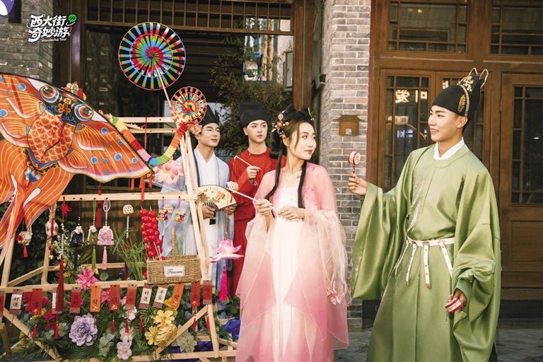 作為古城文化地標(biāo),西大街此次以“沉浸互動”為核心,推出多元體驗。10月1日至8日17:00-22:00,“雙節(jié)奇妙游”活動持續(xù)上演。6大故事主演NPC身著宋代服飾穿梭街區(qū),與游客開展猜燈謎、學(xué)古禮等線下挑戰(zhàn),參與者可贏取可抵扣街區(qū)消費的“銀票”?;顒油介_啟線上直播,讓未到場市民也能“云游”古街。