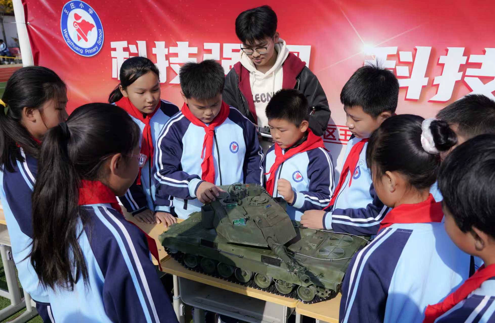操場(chǎng)同步設(shè)置了科技與國(guó)防教育展示區(qū)。無人機(jī)、機(jī)器人等科技設(shè)備吸引學(xué)生駐足體驗(yàn),各類作戰(zhàn)裝備與武器模型則成為“移動(dòng)課堂”。師生們通過零距離觀察與講解,直觀了解現(xiàn)代軍事科技發(fā)展,愛國(guó)情懷與科學(xué)興趣在互動(dòng)中悄然生根。