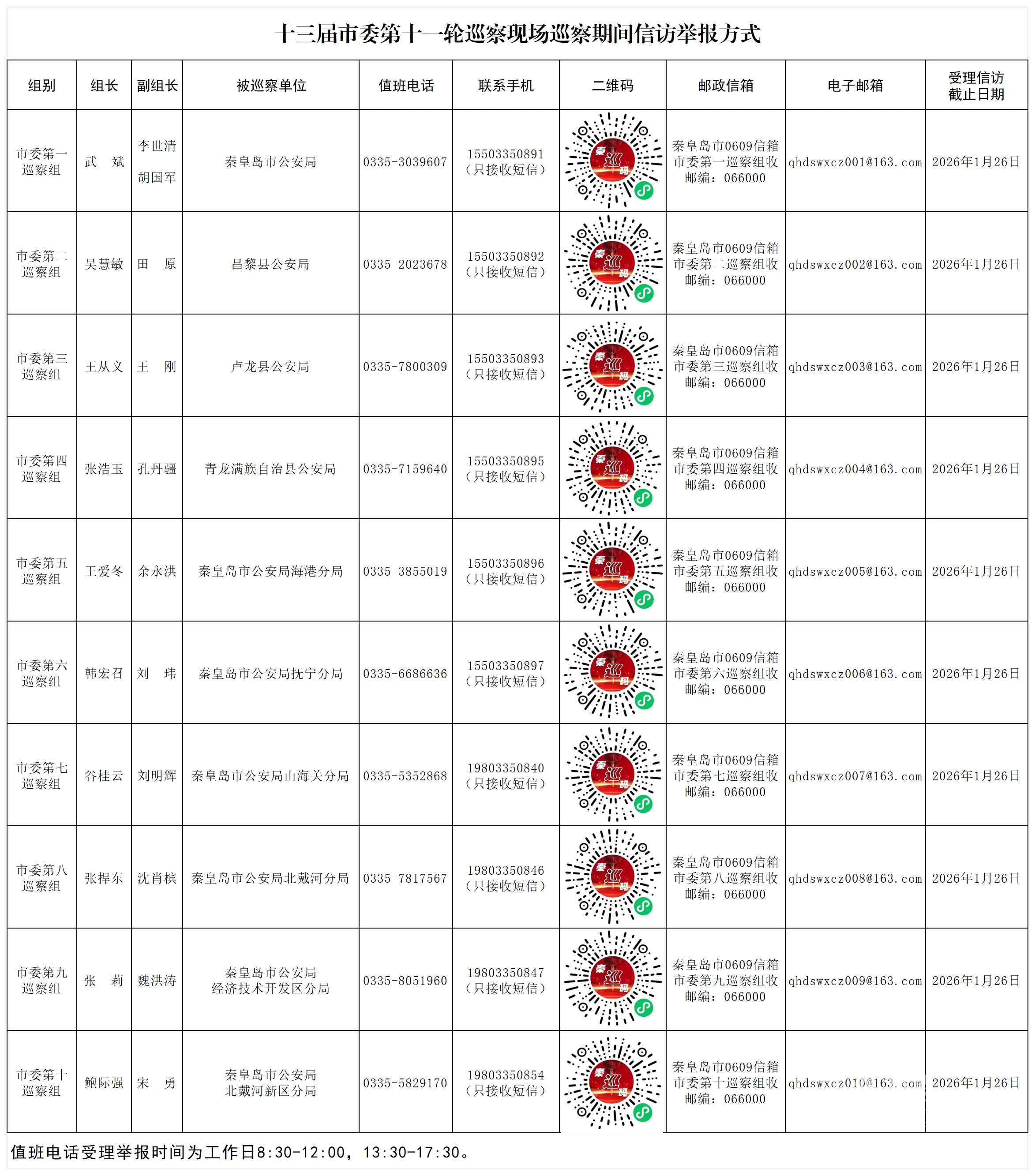 據(jù)悉,市委巡察組將在被巡察單位工作50天左右。10個巡察組將專門設(shè)置值班電話、郵政信箱、電子信箱、信訪受理專用二維碼和固定聯(lián)系信箱,主要受理關(guān)于被巡察單位落實(shí)黨中央決策部署及省市委工作要求,履行全面從嚴(yán)治黨責(zé)任,領(lǐng)導(dǎo)班子、干部人才隊(duì)伍和基層黨組織建設(shè),巡察、審計等監(jiān)督發(fā)現(xiàn)問題整改等方面問題。受理被巡察單位領(lǐng)導(dǎo)班子及其成員、下一級黨組織領(lǐng)導(dǎo)班子主要負(fù)責(zé)人和重要崗位領(lǐng)導(dǎo)干部問題的來電來信來訪,重點(diǎn)是關(guān)于違反政治紀(jì)律、組織紀(jì)律、廉潔紀(jì)律、群眾紀(jì)律、工作紀(jì)律、生活紀(jì)律以及違反中央八項(xiàng)規(guī)定精神等方面的舉報和反映。對關(guān)于個人訴求、涉法涉訴等問題的反映,將按照分級負(fù)責(zé)、屬地管理原則,移交有關(guān)單位處理。巡察組受理信訪時間截止到2026年1月26日。