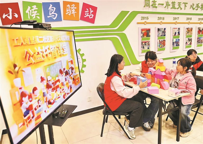 針對(duì)流動(dòng)兒童照料難題,工人南里第二社區(qū)黨委發(fā)動(dòng)黨員創(chuàng)辦了“小候鳥驛站”?!拔覀儼l(fā)現(xiàn)轄區(qū)流動(dòng)人口多,很多孩子放學(xué)后無人照料,就動(dòng)員在職黨員、退休教師組建志愿服務(wù)隊(duì)?!鄙鐓^(qū)黨委書記曹雪晶說。