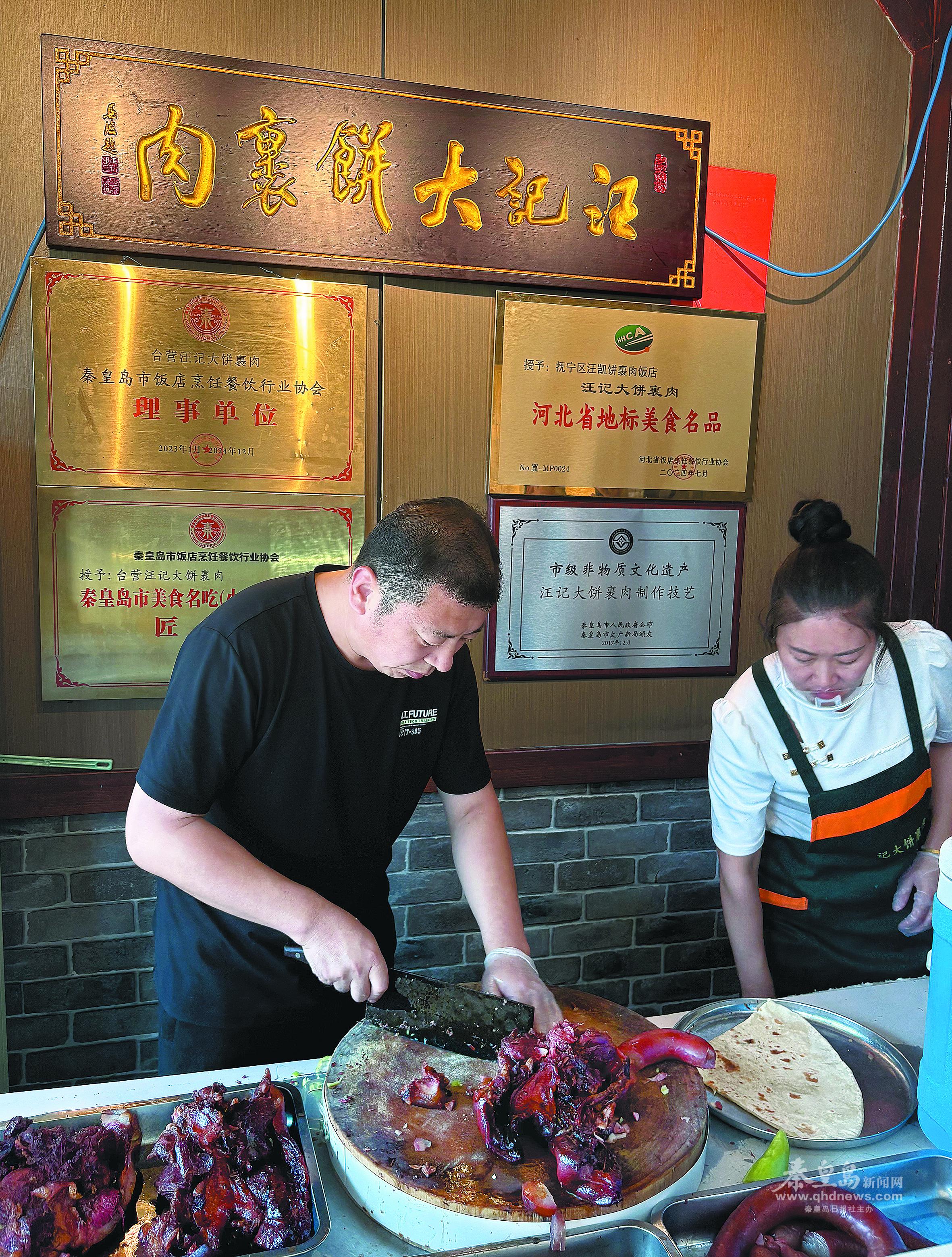 “兩碗羊湯,一盤(pán)豬頭肉,好嘞,美女!”快到午時(shí),300平方米的店鋪已經(jīng)坐滿了,大堂里回蕩著杜冬梅赫亮的嗓音。有的客人拎上幾套熱騰騰的大餅裹肉上了車(chē),有的則買(mǎi)了雞蛋湯或是小菜坐下來(lái)吃。慕名而來(lái)的新客人仔細(xì)觀賞墻上懸掛的自清末、經(jīng)民國(guó)、到如今汪記大餅裹肉各個(gè)時(shí)期經(jīng)營(yíng)場(chǎng)景的繪畫(huà),或是數(shù)一數(shù)“河北省地標(biāo)美食名品”“秦皇島市美食名吃(小吃)展演大賽匠心獎(jiǎng)”等獎(jiǎng)牌。