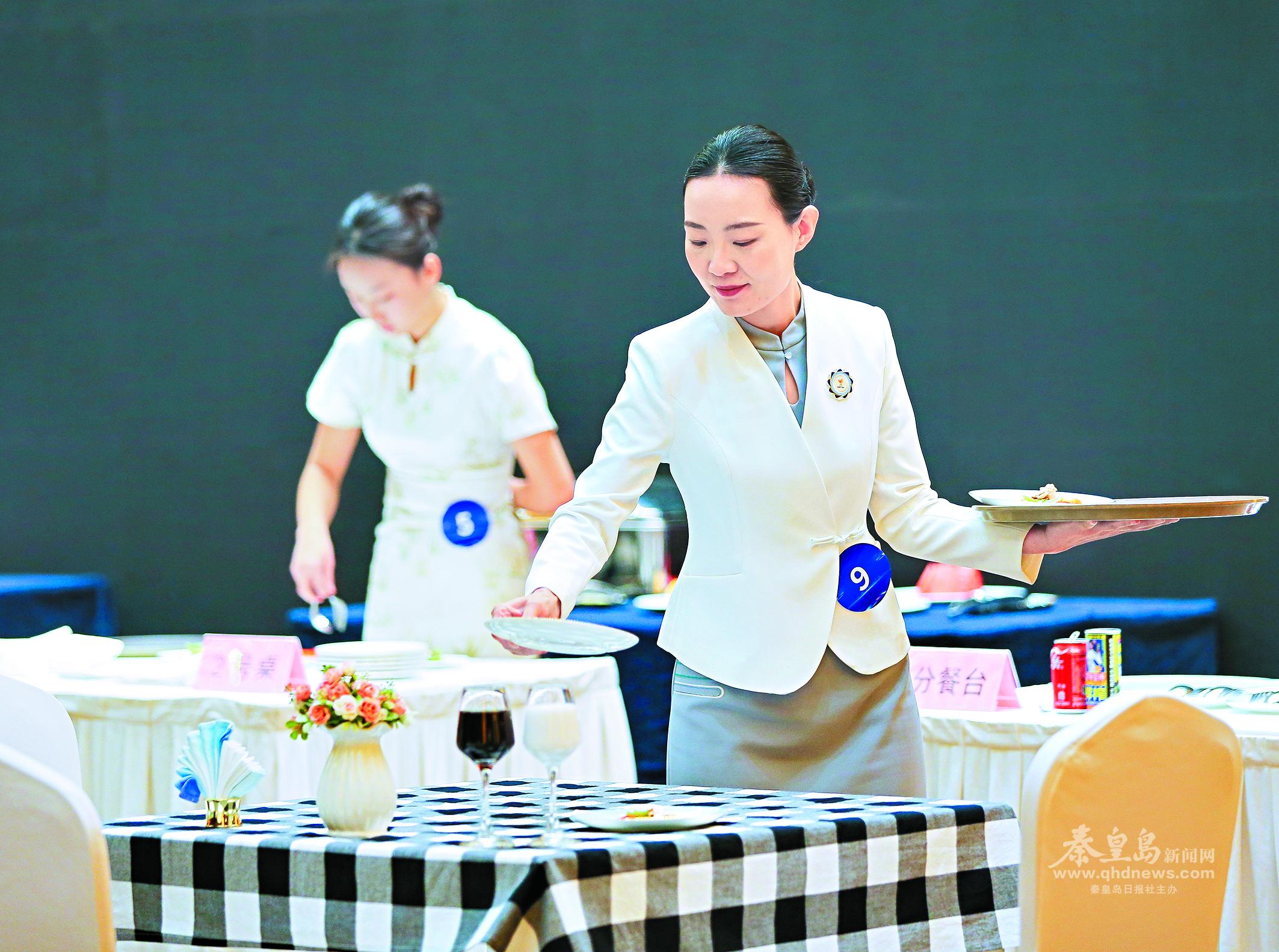 選手在餐廳服務(wù)賽項(xiàng)分餐服務(wù)與儀容儀表比賽中。 記者李鐸 見習(xí)記者劉劍攝