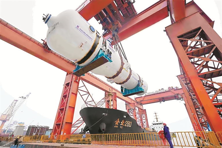 漳州核電二期工程三號(hào)機(jī)組“華龍一號(hào)”蒸汽發(fā)生器準(zhǔn)備裝船發(fā)運(yùn)。通訊員 王繼軍 攝