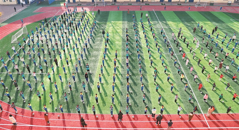 耀華小學學生在大課間展示足球操。