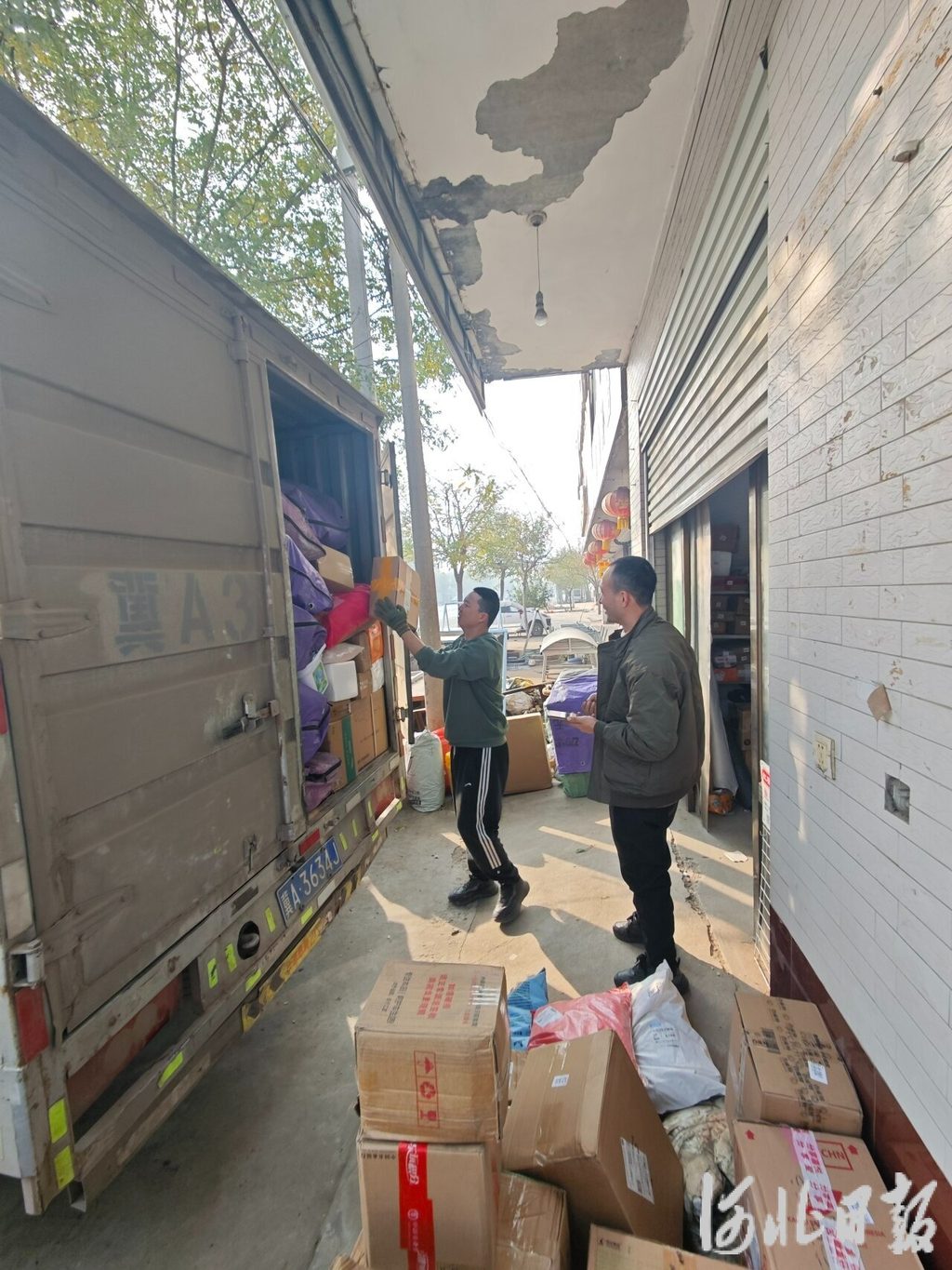 11月12日上午,無極縣張段固鎮(zhèn)東南豐村快遞驛站門口,張滿紅(右)正在與快遞運輸車司機一起卸貨。 河北日報記者 王思達攝