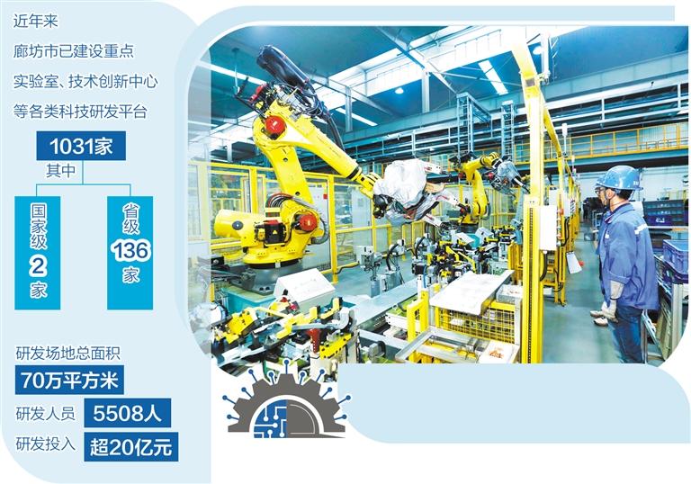 近年來,廊坊市大力推進(jìn)特色產(chǎn)業(yè)集群數(shù)字化、智能化轉(zhuǎn)型升級(jí),推動(dòng)產(chǎn)業(yè)向高端化、智能化、綠色化發(fā)展。全市已建設(shè)重點(diǎn)實(shí)驗(yàn)室、技術(shù)創(chuàng)新中心等各類科技研發(fā)平臺(tái)1031家,其中國(guó)家級(jí)2家、省級(jí)136家;研發(fā)場(chǎng)地總面積70萬(wàn)平方米,研發(fā)人員5508人,研發(fā)投入超20億元,年均實(shí)現(xiàn)技術(shù)突破230次以上,帶動(dòng)工業(yè)投資和技術(shù)改造投資持續(xù)增長(zhǎng)。
