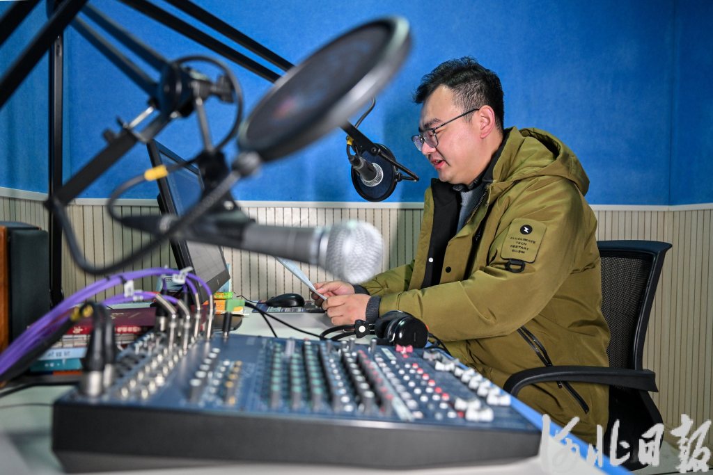 11月8日,昝亞杰利用業(yè)余時間在阿勒泰市融媒體中心配音,為當(dāng)?shù)匚幕顒又?。河北日報記?田明 攝
