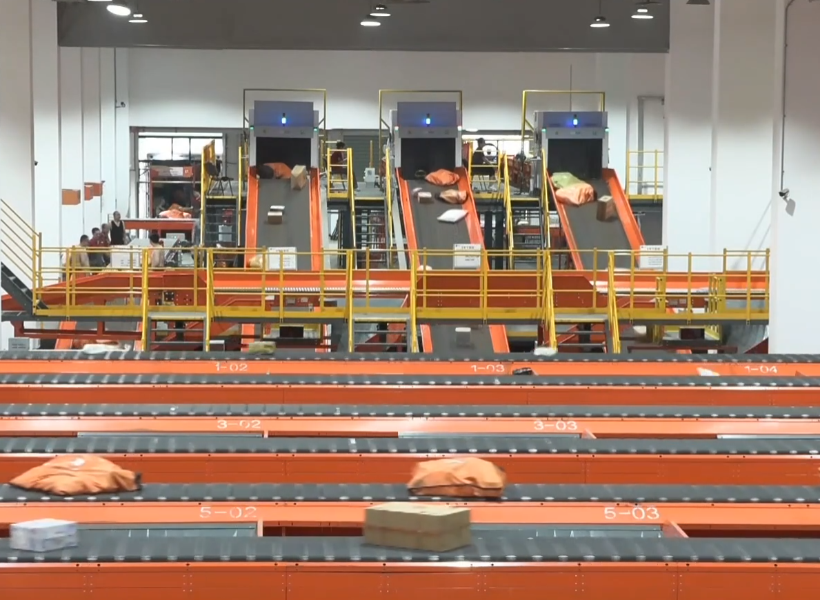 廊坊永清縣圓通速遞北方總部基地二期項目的快遞分揀車間,30條全自動分揀線高速運轉。