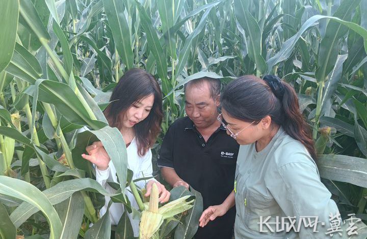 河北省玉米產(chǎn)業(yè)技術(shù)體系邢臺(tái)試驗(yàn)站站長(zhǎng)李艷(左)在邢臺(tái)市南和區(qū)王莊村現(xiàn)場(chǎng)指導(dǎo)農(nóng)戶玉米管理事項(xiàng)。長(zhǎng)城網(wǎng)·冀云客戶端記者 賈宏博 攝