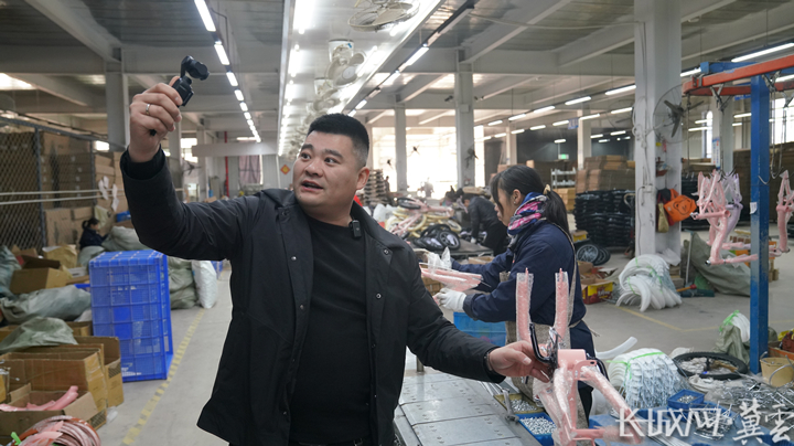 朱宗達(dá)在車間生產(chǎn)線上給直播間粉絲介紹產(chǎn)品。楊澤 攝