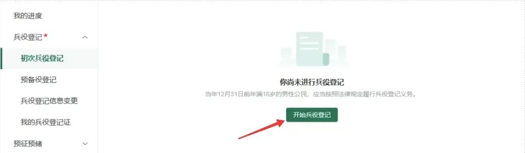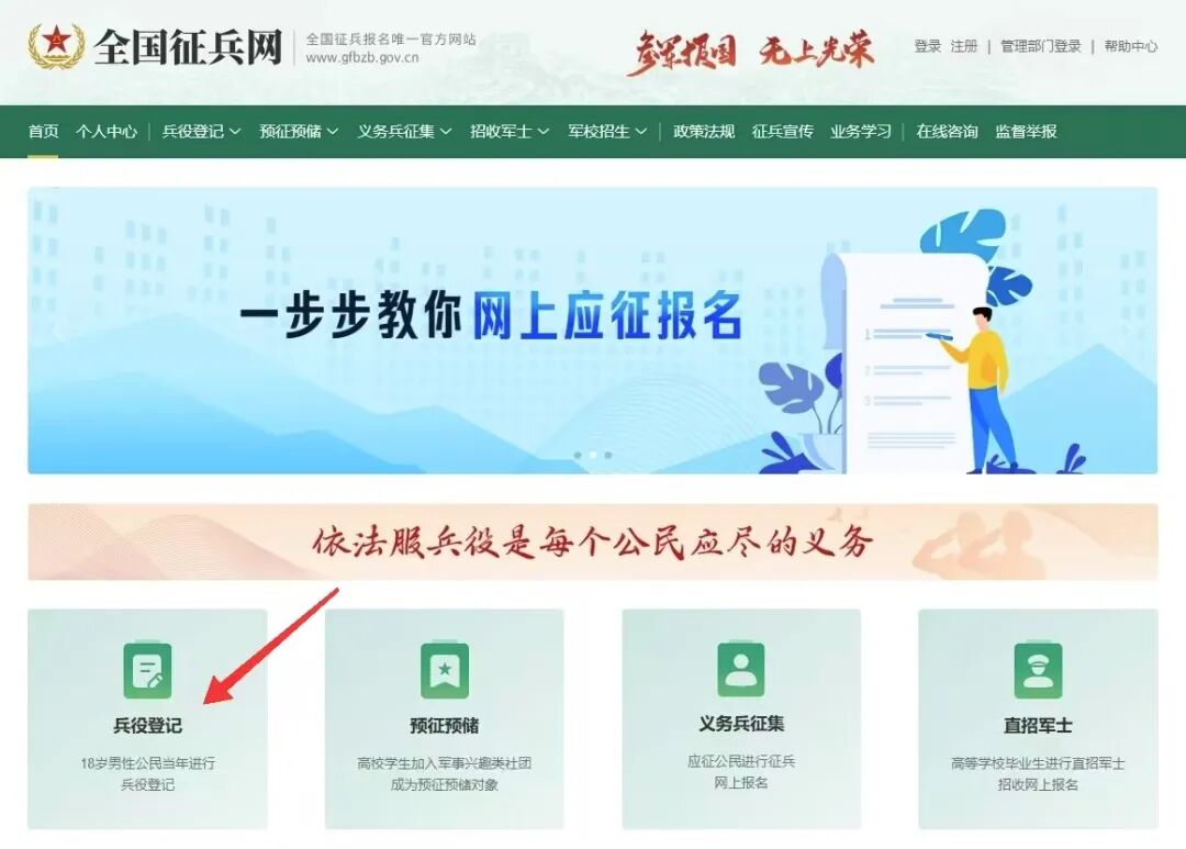 進(jìn)入全國(guó)征兵網(wǎng)首頁(yè),尚未進(jìn)行兵役登記的男青年,需點(diǎn)擊“兵役登記進(jìn)入頁(yè)面進(jìn)行登記。