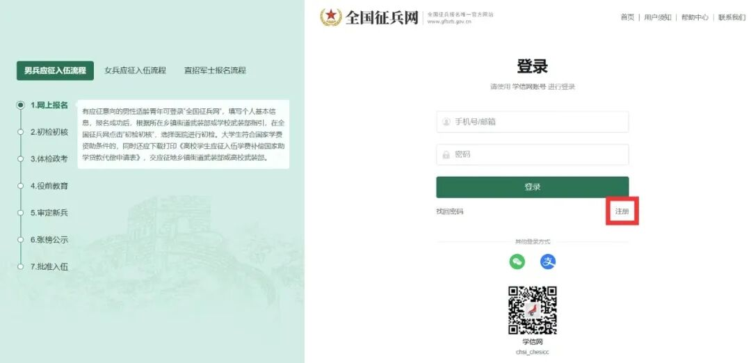 已在學(xué)信網(wǎng)注冊(cè)過(guò)賬號(hào)的,輸入賬號(hào)密碼點(diǎn)擊“登錄”即可;未注冊(cè)過(guò)賬號(hào)的則點(diǎn)擊“注冊(cè)”。注冊(cè)學(xué)信網(wǎng)賬號(hào)必須實(shí)名,務(wù)必要用真實(shí)姓名和身份證認(rèn)真填寫,兵役機(jī)關(guān)將對(duì)有效信息進(jìn)行審核。